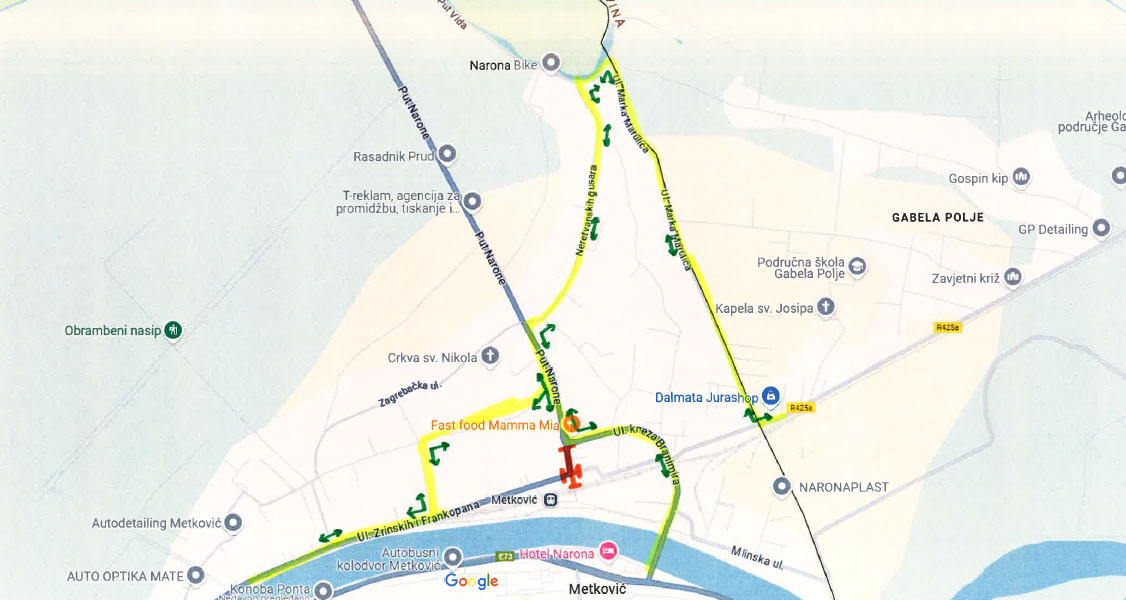 Obilazni pravac iz centra Metkovića prema Graničnom prijelazu Gabela polje i Hercegovačkoj ulici odvijat će se ulicama kneza Branimira/Put Narone/Neretvanskih gusara/Marka Marulića i obratno.