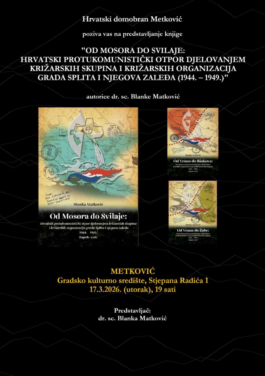 U Metkoviću će se u utorak 17. ožujka 2026. godine s početkom u 19 sati održati predstavljanje nove knjige povjesničarke dr. sc. Blanke Matković pod naslovom “Od Mosora do Svilaje: Hrvatski protukomunistički otpor djelovanjem križarskih skupina i križarskih organizacija grada Splita i njegova zaleđa (1944.–1949.)”.